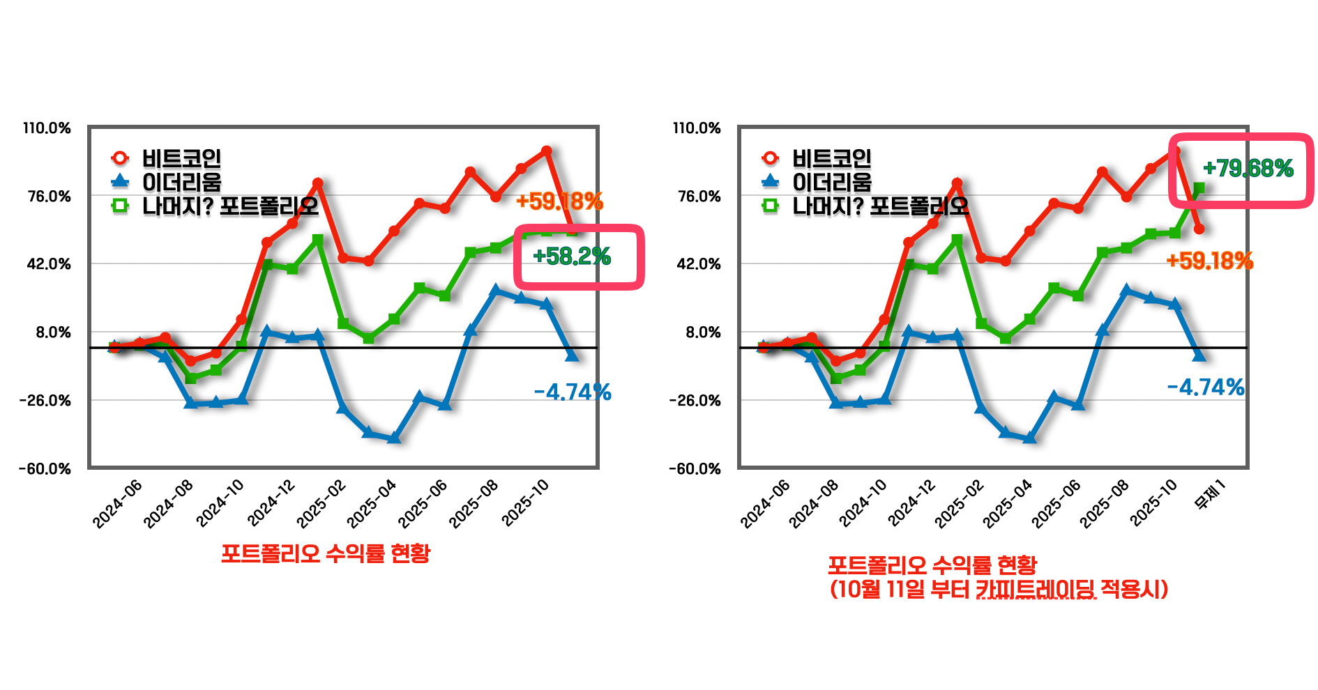 상당히 벌어졌었던 비트코인과의 수익률이 불과 1%차이 수준으로 좁혀졌습니다.